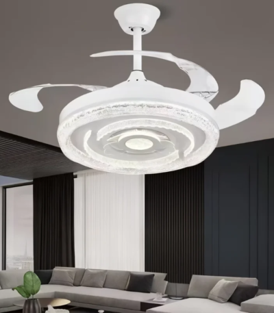 Specification Type: LED ceiling fan with retractable blades (indoor) Finish / Color: Matte white with clear acrylic blades Blade Action: Blades extend while the fan runs and retract when off Blade Span (extended): ≈ 42″ class (varies slightly by model) Light Source: Integrated LED ring with frosted diffuser Color Temperature: 3CCT selectable: 3000K / 4000K / 6500K Fan Speeds: Multiple speeds via remote control Power (typ.): Fan 30–40W | LED 24–36W (depends on version) Voltage: AC 220–240V, 50/60Hz (UAE standard) Controls: Remote: fan on/off & speed, light on/off, 3CCT selection Mounting: Downrod mount; short/long rods available Ceiling Height: Recommended ≥ 2.6 m Room Size: Guide 12–20 m² living rooms, bedrooms, majlis IP Rating: IP20 (indoor use) Warranty: 2 years What’s Included: Fan body with LED module, retractable blades, remote, mounting kit