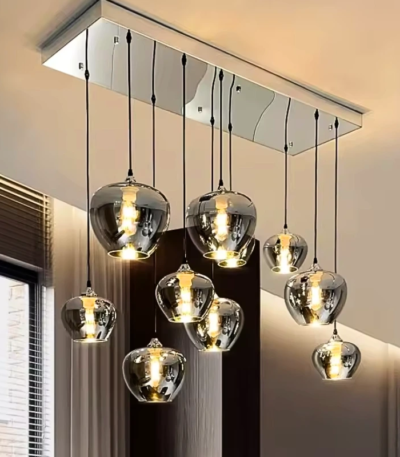 Specification Material: Metallic glass + metal Color: Silver-gold reflective tone Light Source: E27 LED bulbs Voltage: AC 110–240V Installation Type: Hanging pendant style Number of Lights: 6–9 adjustable pendants Cable Length: Adjustable height Application: Living room, dining room, foyer, cafes, restaurants