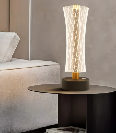Specification Type: Portable LED table lamp (indoor) Design: Curved 3D acrylic shade with etched light pattern; round base with touch switch Finish: Matte dark base with gold accent Dimensions: ~300–350 mm height; base Ø ~110–130 mm Light Source: Integrated LED Power: 5–8W Color Temperature: 3CCT selectable: 3000K / 4000K / 6500K Dimming: Touch dimming (step or stepless, model dependent) Battery: Rechargeable Li-ion, 2000–4000 mAh (typ.) Runtime: ≈ 8–20 hours per charge (brightness dependent) Charging: USB-C/USB 5V input; cable included Input Voltage (charging): 5V DC Materials: Acrylic diffuser, metal/plastic base IP Rating: IP20 (indoor use) Warranty: 1 year Applications: Bedside, living room, home office, café tables, reception counters