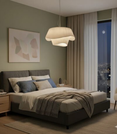 A gracefully layered fabric pendant with a unique undulating silhouette that creates a soft, sculptural atmosphere.