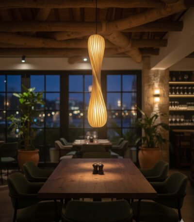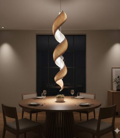 A striking, twisted architectural pendant that creates a sculptural focal point with warm, organic light.