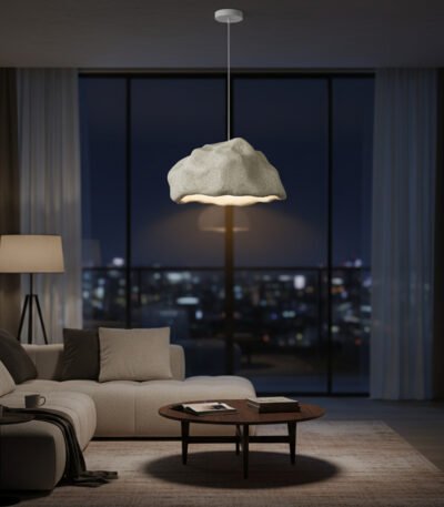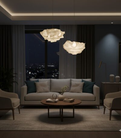 د.إ420.00 – د.إ850.00Price range: د.إ420.00 through د.إ850.00The Tense Pendant Lamp is a study in modern, soft minimalism. This striking lamp mimics a soft, floating cloud, crafted from a luxurious silk shade stretched over a lightweight frame. It provides a beautifully diffuse, warm glow, adding a dreamy, high-end, and ethereal quality to any contemporary space.