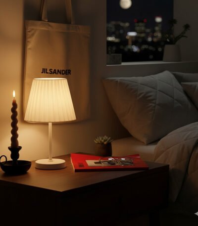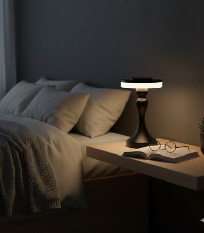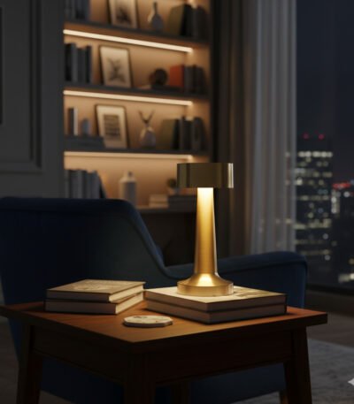 A sleek, portable table lamp with a minimalist metallic design, perfect for adding a touch of modern luxury.