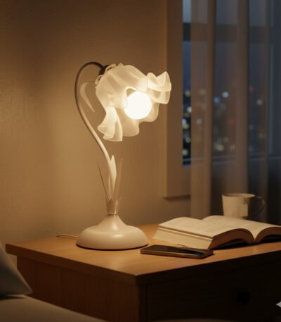 A charming bedside lamp designed like a drooping flower, featuring a curved stem and delicate leaf details.