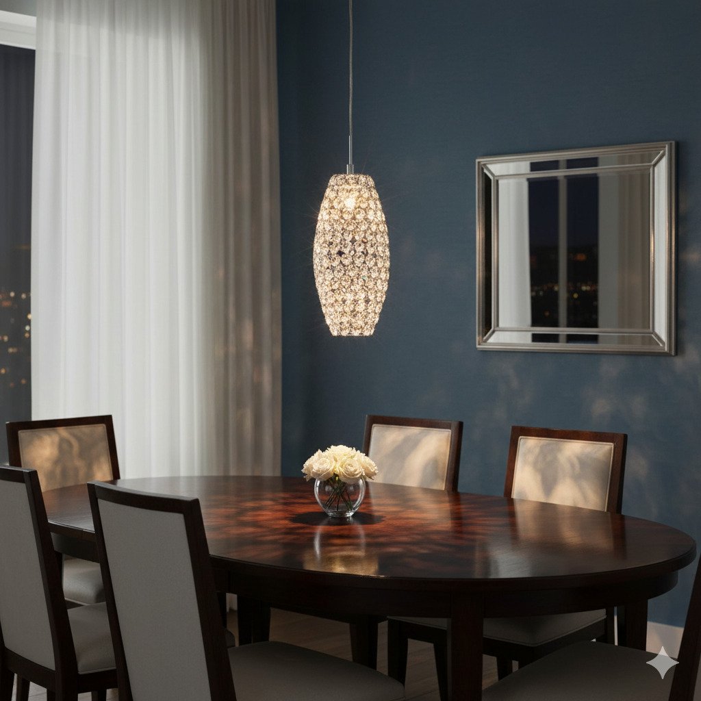 This fixture features a sophisticated oval or egg-shaped design, completely covered in faceted glass crystals. When illuminated, the crystals refract the light to create a sparkling, jewel-like effect that adds glamour and elegance to any space. It is perfectly suited for hanging over a dining table (as shown in your image), in a hallway, or as a pair over a kitchen island.