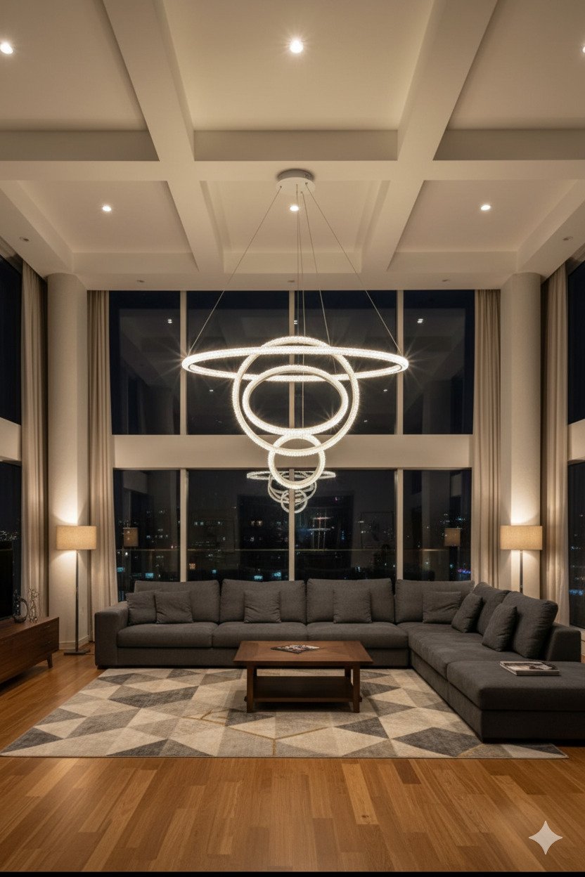 This grand fixture serves as a magnificent centerpiece for high-ceilinged spaces, such as duplex living rooms or foyers. It consists of suspended rings adorned with high-quality crystals that catch and refract light, creating a dazzling display. The halo-like rings provide 360-degree illumination, combining contemporary geometric form with the timeless elegance of crystal to create a sophisticated atmosphere.