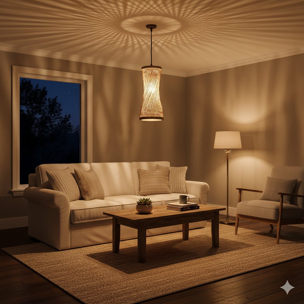 This organic fixture features a cylindrical shape that has been artistically twisted at the center, creating an hourglass profile. Crafted from light beige bamboo strips, it filters the light to create a warm glow while projecting mesmerizing, radial shadows on the ceiling (as clearly visible in your photograph). It is an affordable yet striking choice for adding natural texture and a relaxed, bohemian vibe to a living room or cozy corner.