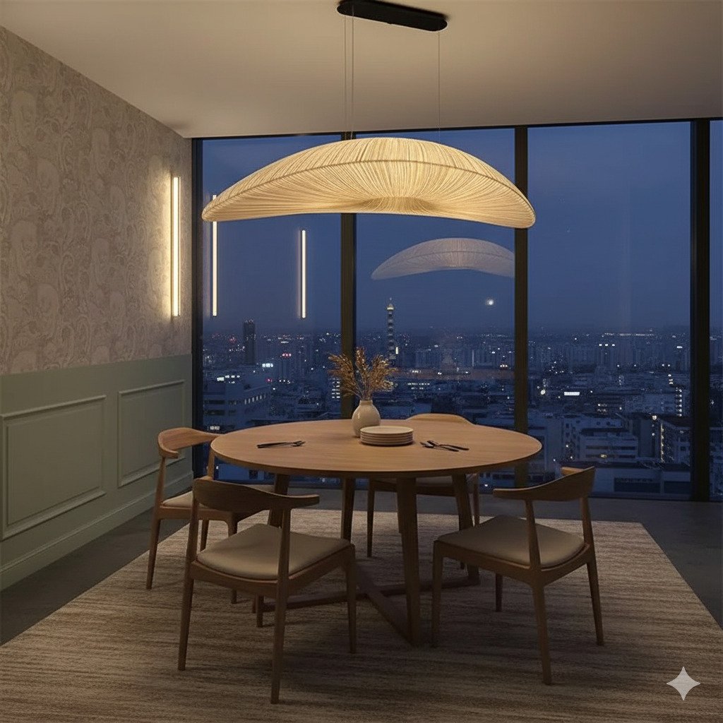 This grand fixture is designed to define a space. Unlike smaller pendants, its substantial width (starting at 1 meter) makes it an architectural centerpiece perfect for large dining tables or high-ceilinged living rooms. The shade is crafted from natural banana fiber fabric stretched over a frame, which gives it that distinctive fine ribbed texture and a rich, warm “yellow” or beige glow when illuminated, creating a cozy yet sophisticated atmosphere.
