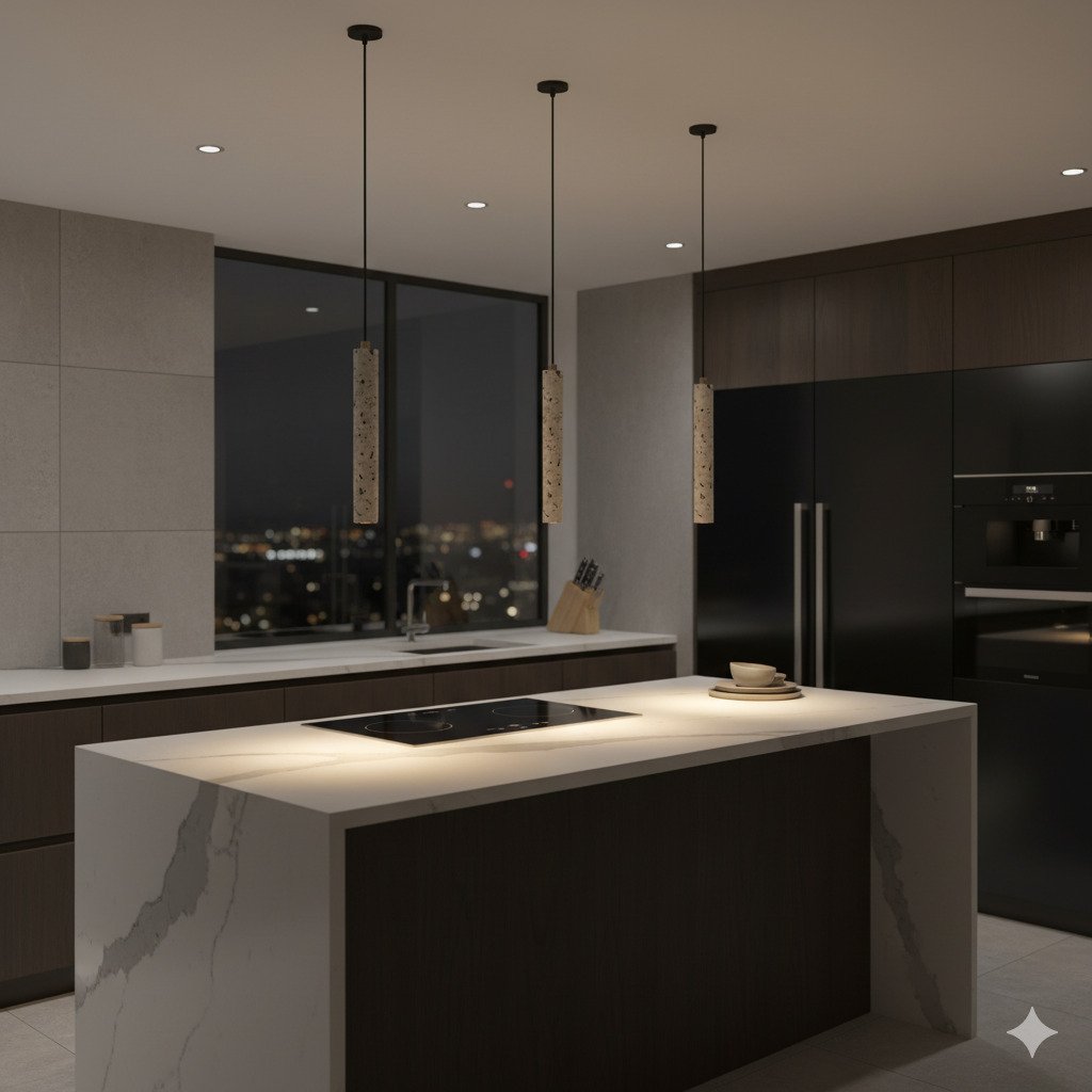 This fixture combines the raw, industrial appeal of cement with the playful texture of terrazzo. The “White+BK Dot” finish features a white stone/cement body embedded with contrasting black chips, creating a stylish speckled look. Its simple cylindrical silhouette makes it perfect for arranging in a row above a kitchen island (as shown in your image) or a breakfast bar, providing focused downlight with a modern, architectural edge.