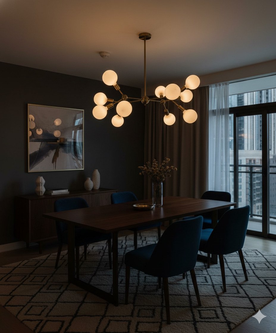 This sophisticated 12-light chandelier is designed to be the centerpiece of high-ceilinged spaces. Featuring a branching, architectural “Sputnik” design in a premium gold finish, it provides uniform and warm illumination through its frosted spherical shades. Its wide spread makes it exceptionally well-suited for large dining rooms, grand living areas, or hotel foyers where both a high light output and a bold decorative statement are required.