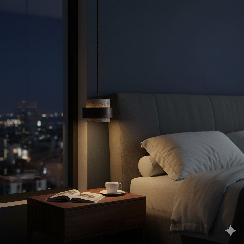 A sophisticated blend of organic wood and industrial cement that provides focused, warm bedside lighting.