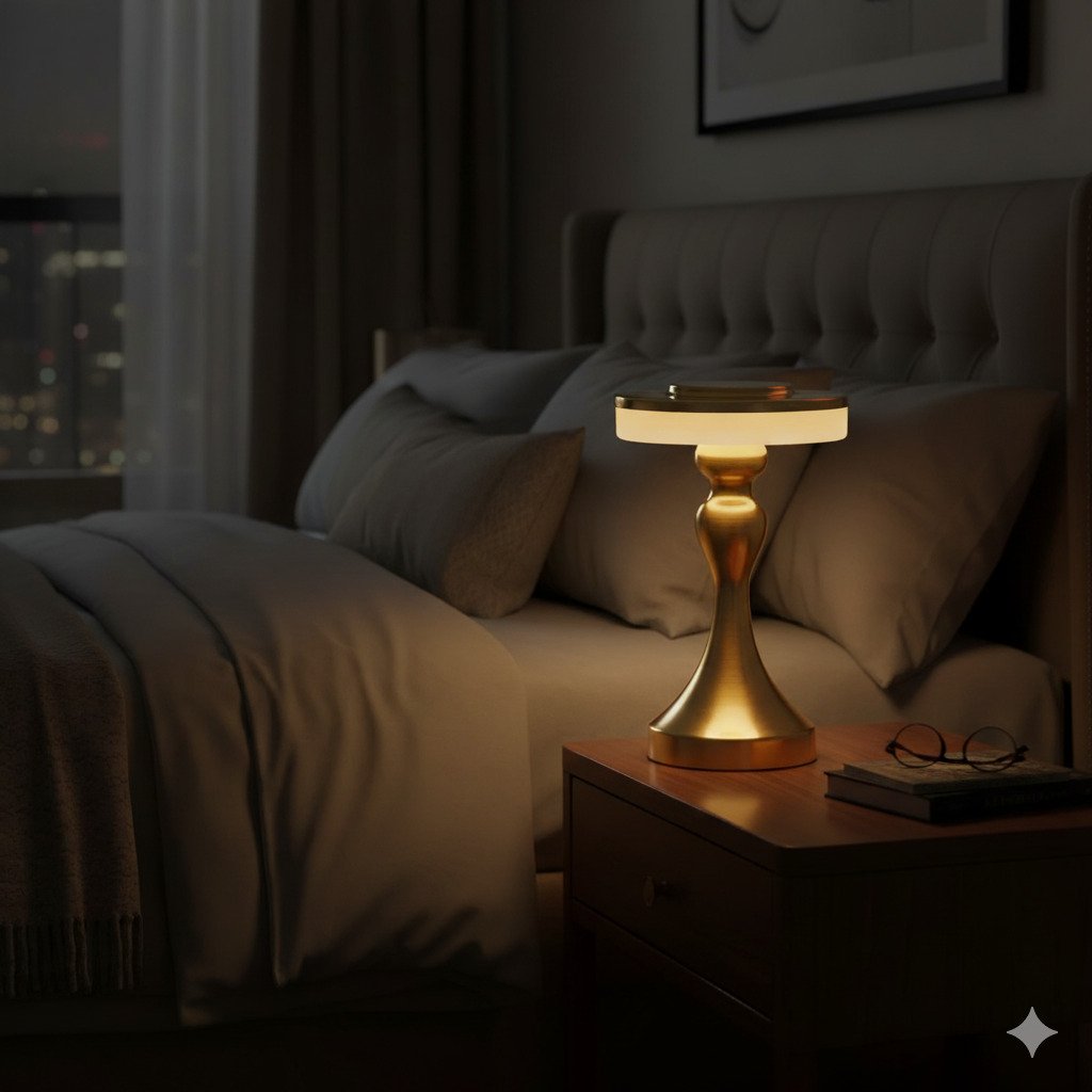 A sleek, portable table lamp with a minimalist metallic design, perfect for adding a touch of modern luxury.