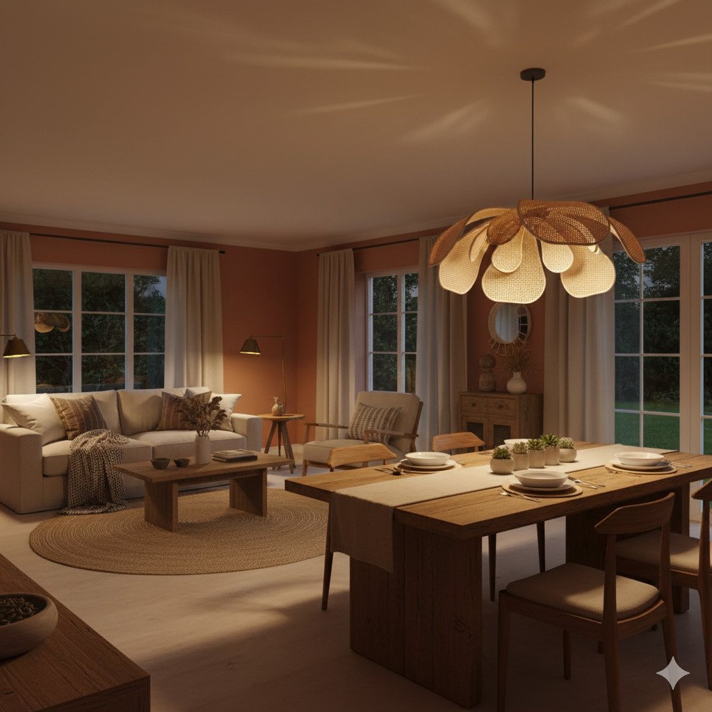 This exquisite pendant light is designed to mimic the natural elegance of a blooming flower. Its petals are crafted from high-quality fabric that diffuses light softly, eliminating harsh shadows and creating a warm, inviting glow. It is perfectly suited for installation over dining tables (as seen in your reference), in master bedrooms to add a touch of romance, or in boutique lounge areas. Its sculptural presence adds a sense of “soft-modern” luxury to a space even when the light is turned off.