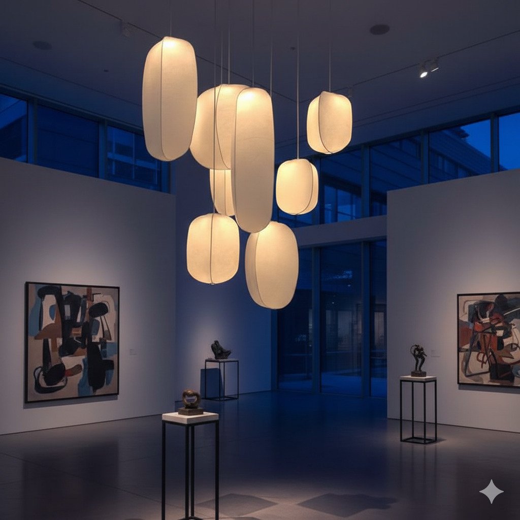 This elegant pendant features a long, pill-shaped fabric shade that beautifully softens light, casting an ethereal and warm glow throughout the room. Its understated yet sculptural design makes it an exceptional choice for modern art galleries, professional lounges, or high-ceilinged living spaces. As demonstrated in the provided image, these lights are most effective when installed in varied clusters at different heights, creating a floating, cloud-like installation that serves as both a functional light source and a sophisticated piece of interior art.