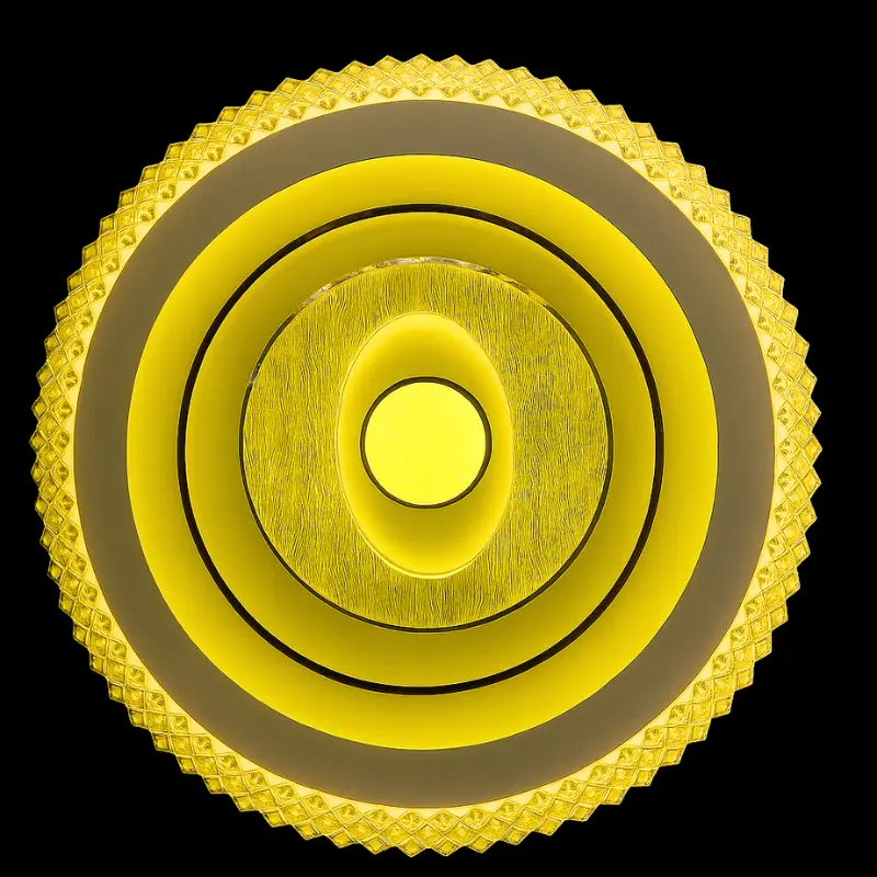 Design: Layered concentric rings with decorative outer texture; opal acrylic diffuser