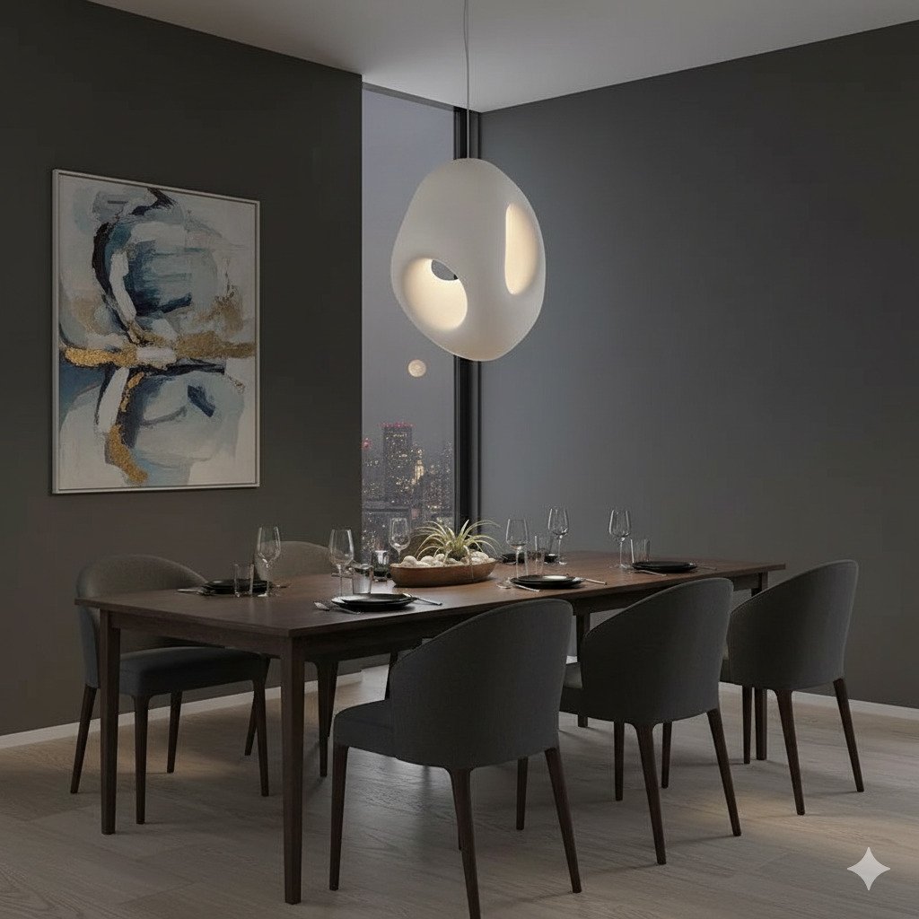 The Raisen-2 Hole pendant is a bold statement piece of modern architectural lighting. Its smooth, asymmetrical fiber shell features large, thoughtfully placed openings that allow warm light to emanate from the interior, creating a beautiful interplay of light and shadow. Its boulder-like, organic form brings a sense of refined, otherworldly elegance to contemporary interiors. As demonstrated in the provided dining setting, it is exceptionally well-suited for placement over large tables or in open-plan living areas where its unique, sculptural presence can be appreciated from all angles.