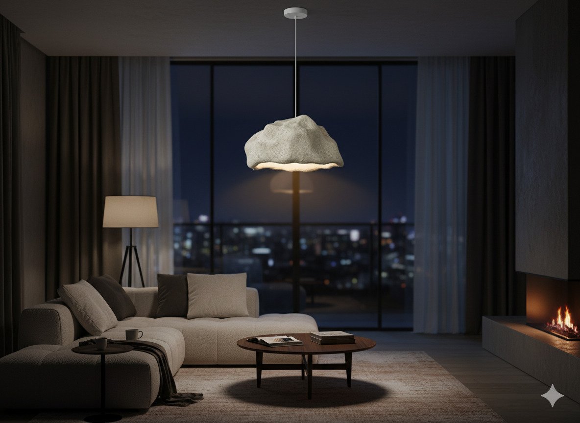 A sculptural, rock-inspired pendant that brings raw, organic textures and a grounded presence to modern interiors.