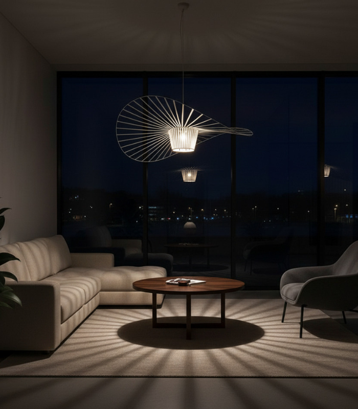 The Vertigo Pendant Light by Petite Friture is a truly iconic piece of modern design. This extra-large, yet incredibly lightweight, “cabin” lamp creates a dramatic and graphic statement in any room. When lit, it casts a stunning, intricate shadow pattern across the ceiling, bringing your space to life.