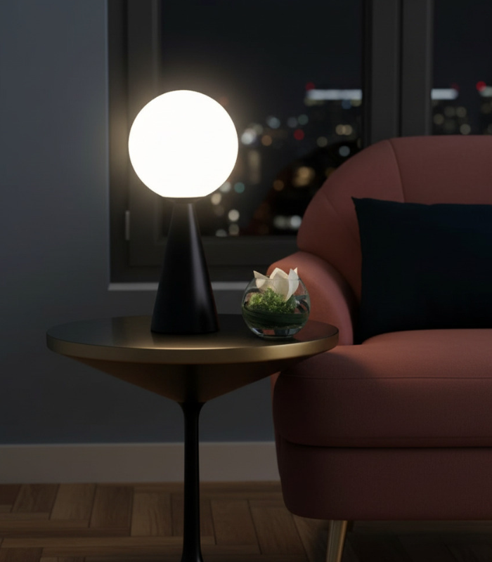 - Design: A modern fusion of a metallic cone base and a white glass globe.