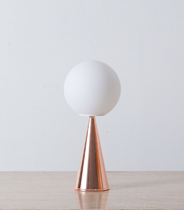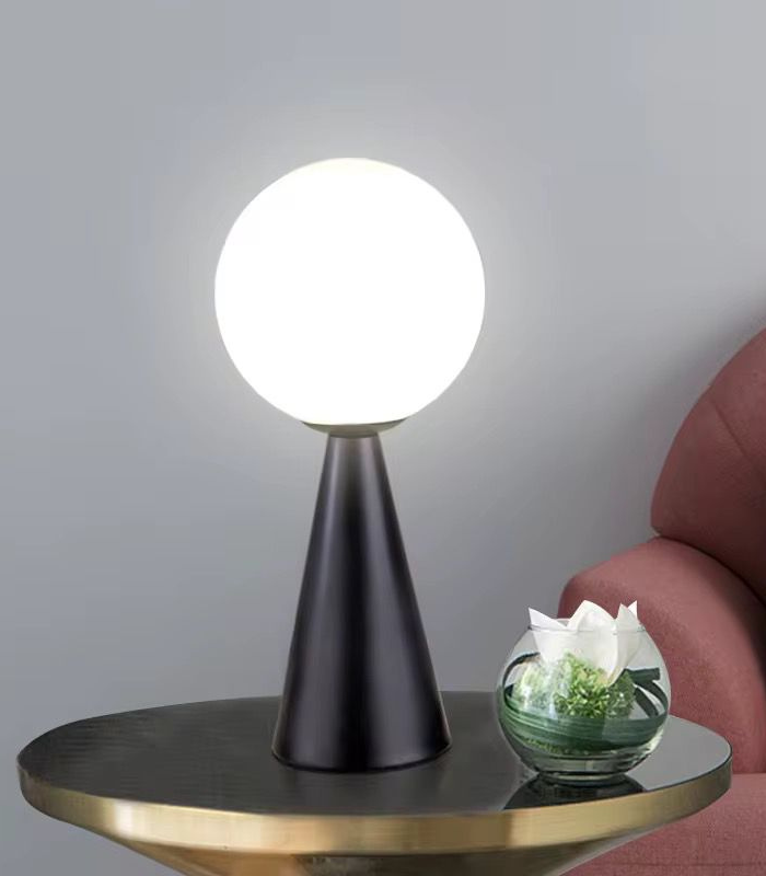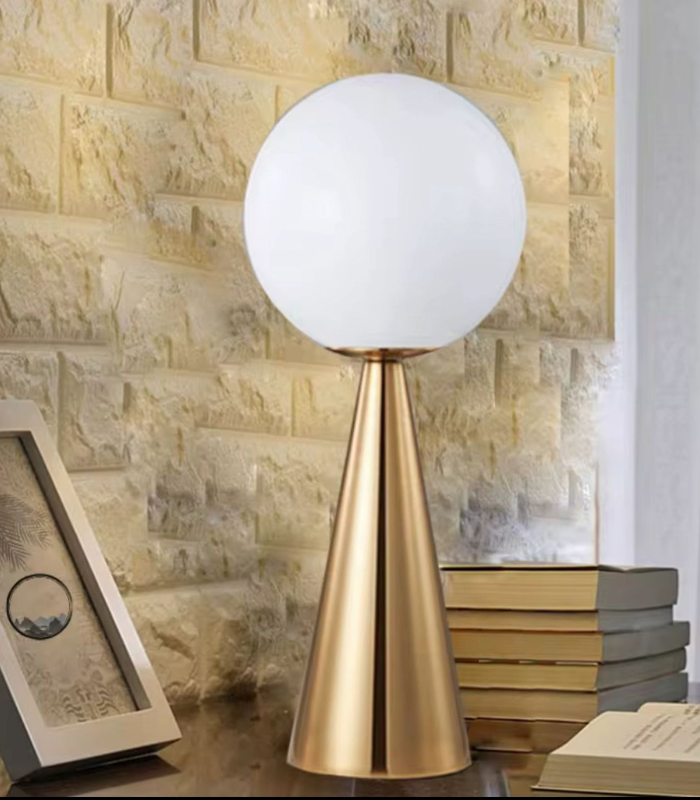 The lamp’s design features a striking contrast: a sharp, conical base in a brushed metallic gold finish provides a strong, modern foundation. This is topped by a perfectly spherical white glass ball, which diffuses the light to create a soft, warm, and inviting glow.