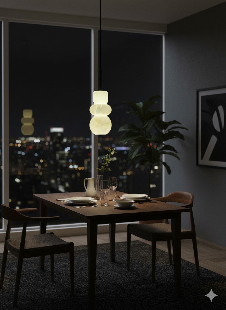 Crafted from genuine marble, this fixture creates a stunning visual statement with its “totem” design of stacked, organically shaped stones. When lit, the marble becomes translucent, revealing natural veining and casting a soft, ambient light that is perfect for creating an intimate atmosphere over dining tables, kitchen islands, or as bedside reading lights.